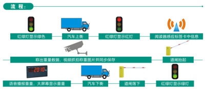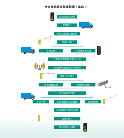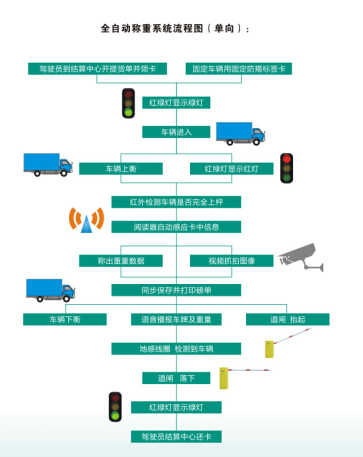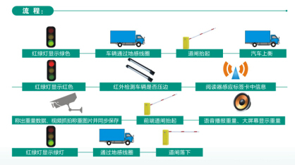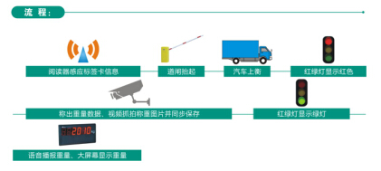 紅綠燈顯示綠色---車輛通過地感線圈---道閘抬起---汽車上衡---紅綠燈顯示紅色---紅外檢測車輛是否壓邊---閱讀器感應標簽卡中信息---稱出重量數據、視頻抓拍稱重圖片并同步保存---前端道閘抬起---語音播報重量、大屏幕顯示重量---紅綠燈顯示綠燈---通過地感線圈---道閘落下